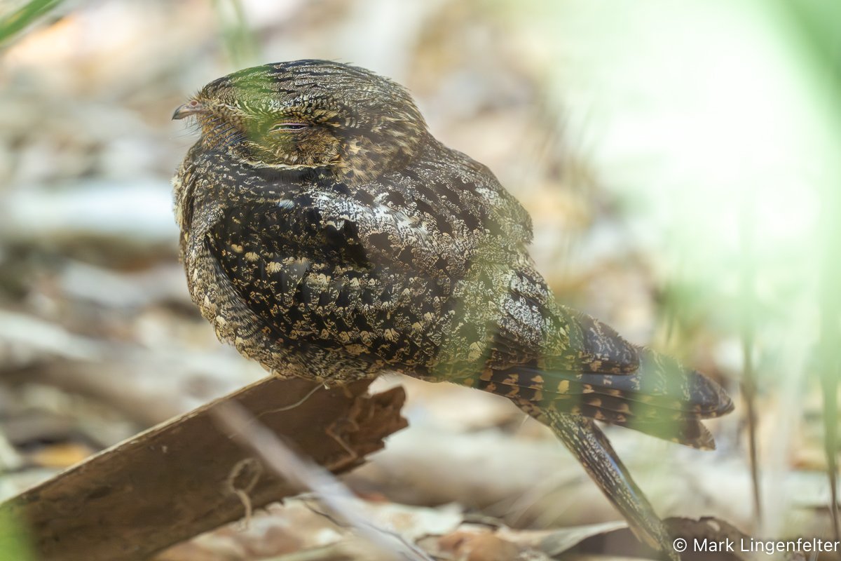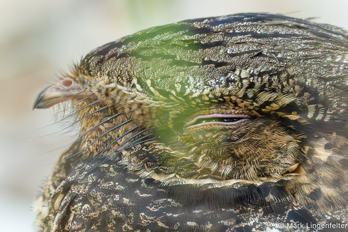 Notice the feelers around the mouth on the cropped image. The primary term for the stiff, hair-like tactile bristles found around the mouth or base of the beak in many bird species is rictal bristles. These structures, often found in insectivorous and nocturnal birds, are sometimes referred to as facial bristles, vibrissae, or simply sensory bristles. (Unfortunately the bird was sleeping in a safe place covered by overgrowth making a clean image without overlying branches impossible as you can see with the green overlying the images.)
