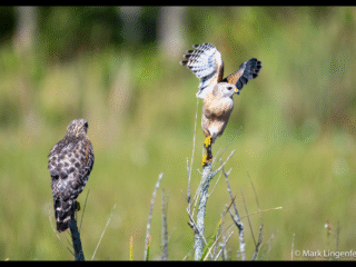 The red-shouldered hawk (Buteo lineatus) is a medium-sized buteo. Its breeding range spans eastern North America and along the coast of California and northern to northeastern-central Mexico. It is a permanent resident throughout most of its range, though northern birds do migrate, mostly to central Mexico.